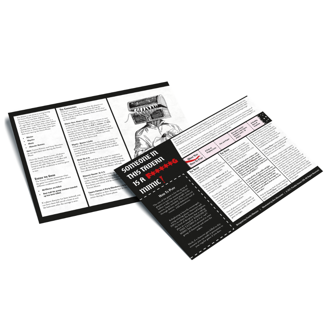 In the spirit of other social deduction games, SOMEONE IN THIS TAVERN IS F***** MIMIC!, does what it says on the tin. Someone amongst you at the table is a Mimic with murderous intentions and its up to the rest of the group to find out who it is before they kill their way through most of the patrons.